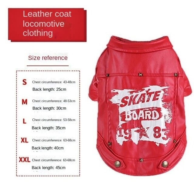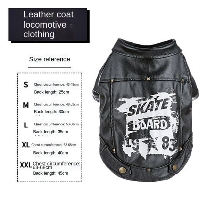 革ジャン風のデザインのスケートボードと印字されたドッグウェアです。